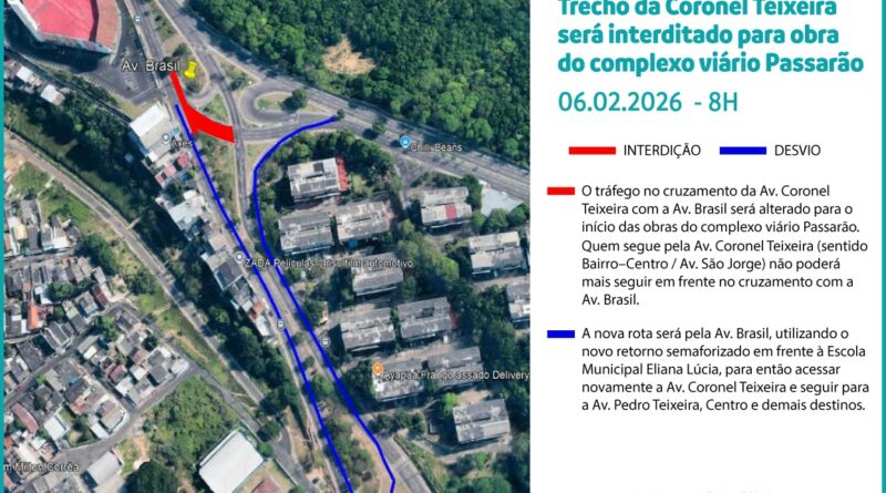 A Prefeitura de Manaus, por meio do Instituto Municipal de Mobilidade Urbana (IMMU), informa que, a partir desta sexta-feira, 6/2, às 8h, o tráfego no cruzamento da avenida Coronel Teixeira com a avenida Brasil passará por alterações para a realização das obras do complexo viário Passarão.